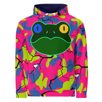 This unique frog hoodie is made for people who like colorful and bold streetwear. It features a bright neon camo design with a hand-drawn frog face on the front. The frog has mismatched eyes—one blue and one yellow—giving the hoodie a standout look.